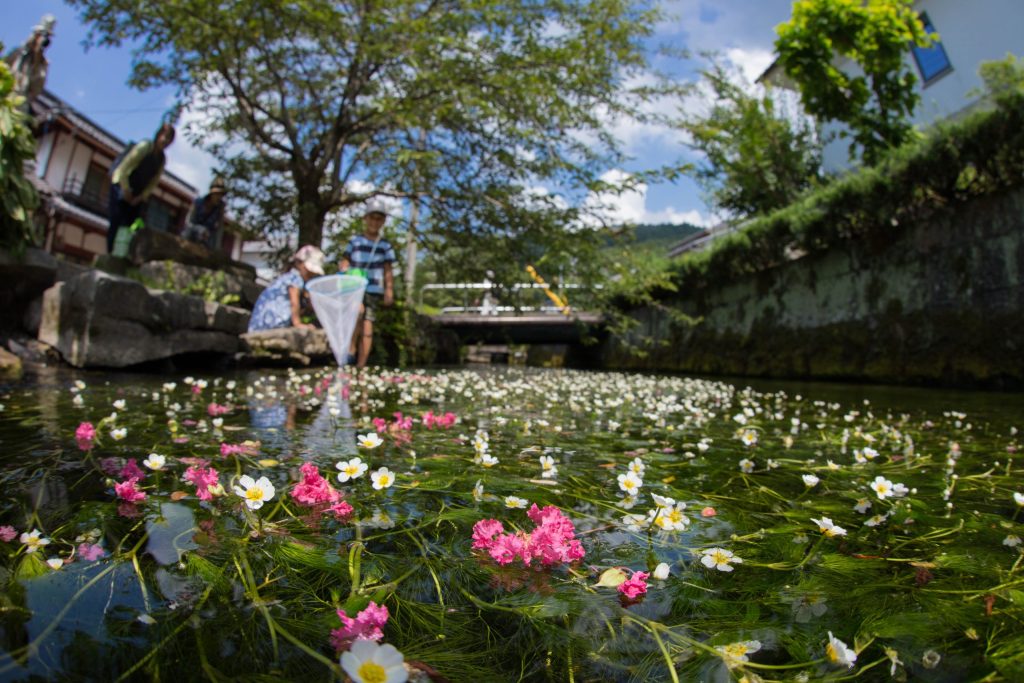 地蔵川に咲く【水中花・梅花藻(ばいかも)】は、この時期ならではの涼やかな景観。7月初旬から9月中旬までが見ごろです。